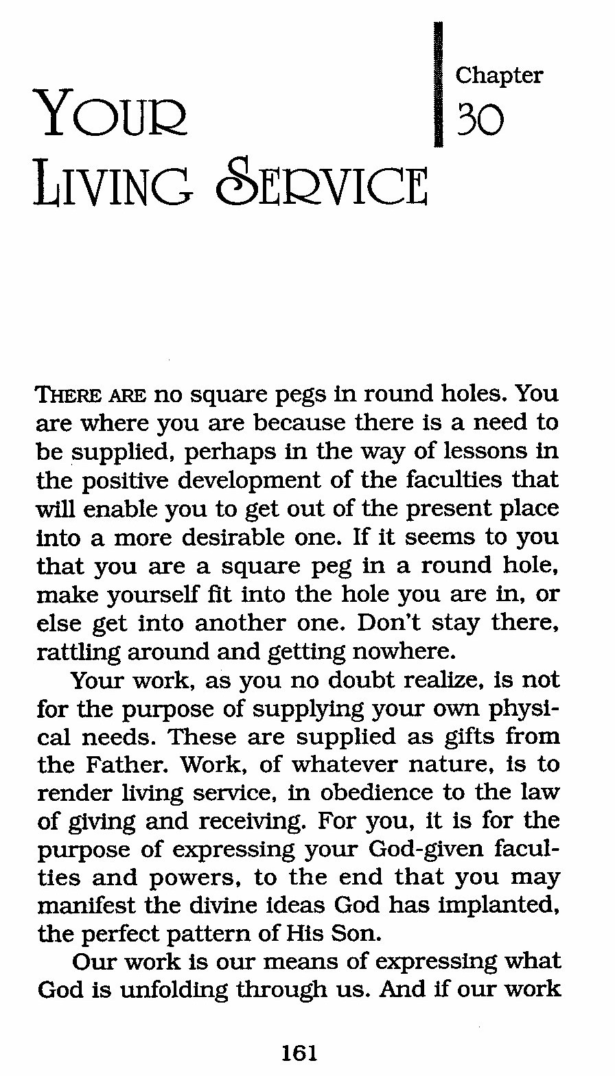 Your work, as you no doubt realize, is not for the purpose of supplying your own physical needs. These are supplied as gifts from the Father. Work, of whatever nature, is to render living service, in obedience to the law of giving and receiving. For you, it is for the purpose of expressing your God-given faculties and powers, to the end that you may manifest the divine ideas God has implanted, the perfect pattern of His Son.
