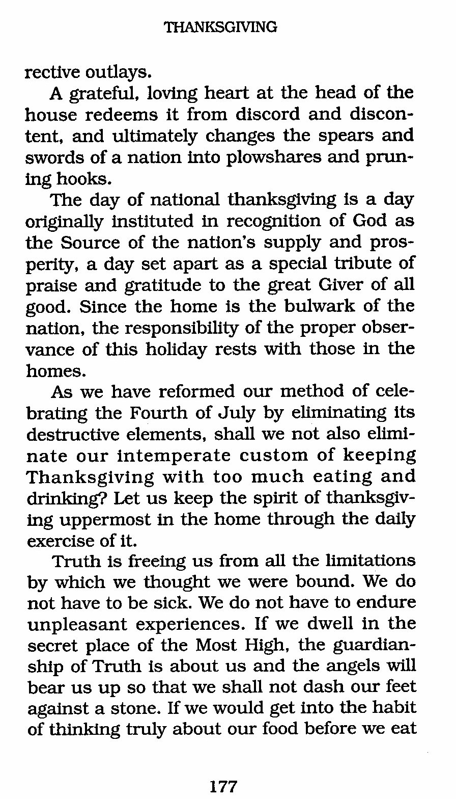 As we have reformed our method of celebrating the Fourth of July by eliminating its destructive elements, shall we not also eliminate our intemperate custom of keeping Thanksgiving with too much eating and drinking? Let us keep the spirit of thanksgiving uppermost in the home through the daily exercise of it.