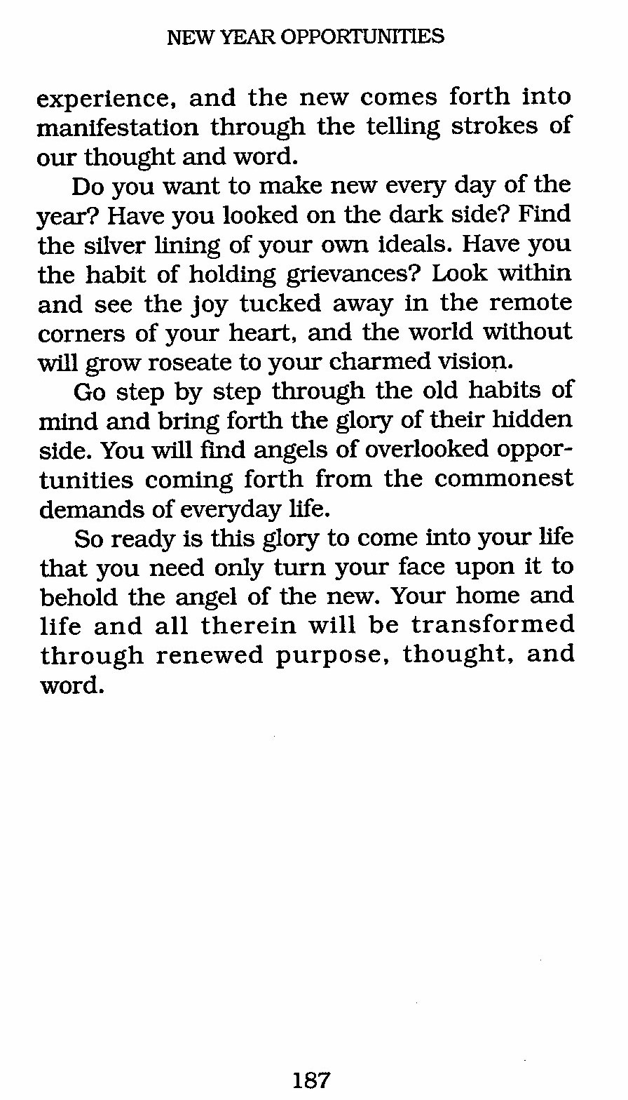 So ready is this glory to come into your life that you need only turn your face upon it to behold the angel of the new. Your home and life and all therein will be transformed through renewed purpose, thought, and word.