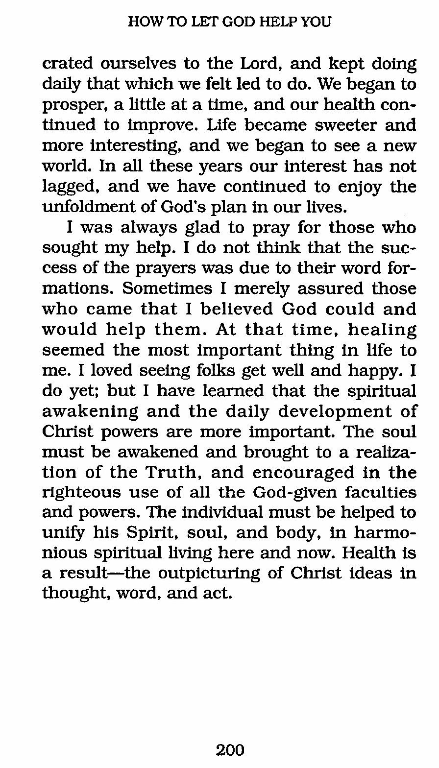 I was always glad to pray for those who sought my help. I do not think that the success of the prayers was due to their word formations. Sometimes I merely assured those who came that I believed God could and would help them. At that time, healing seemed the most important thing in life to me. I loved seeing folks get well and happy. I do yet; but I have learned that the spiritual awakening and the daily development of Christ powers are more important. The soul must be awakened and brought to a realization of the Truth, and encouraged in the righteous use of all the God-given faculties and powers. The individual must be helped to unify his Spirit, soul, and body, in harmonious spiritual living here and now. Health is a result --- the outpicturing of Christ ideas in thought, word, and act.