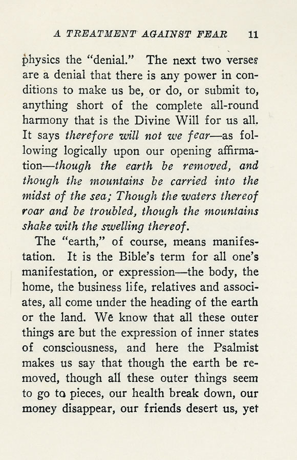the "denial." The next two verses are a denial that there is any power in conditions to make us be, or do, or submit to, anything short of the complete all-round harmony that is the Divine Will for us all. It says therefore will not we fear—as following logically upon our opening affirmation—though the earth be removed, and though the mountains be carried into the midst of the sea; Though the waters thereof roar and be troubled, though the mountains shake with the swelling thereof.