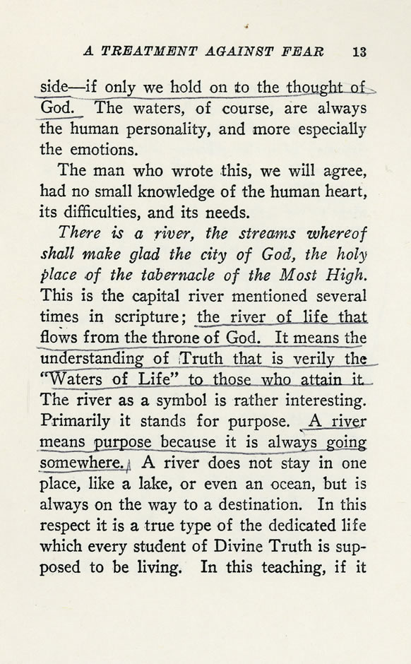 There is a river, the streams whereof shall make glad the city of God, the holy place of the tabernacle of the Most High. This is the capital river mentioned several times in scripture; the river of life that flows from the throne of God. It means the understanding of Truth that is verily the "Waters of Life" to those who to those who attain it. The river as a symbol is rather interesting. Primarily it stands for purpose. A river means purpose because it is always going somewhere. A river does not stay in one place, like a lake, or even an ocean, but is always on the way to a destination. In this respect it is a true type of the dedicated life which every student of Divine Truth is supposed to be living. In this teaching, if it