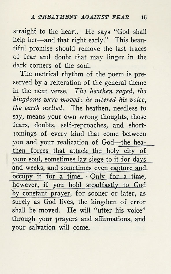 The metrical rhythm of the poem is preserved by a reiteration of the general theme in the next verse. The heathen raged, the kingdoms were moved: he uttered his voice, the earth melted. The heathen, needless to say, means your own wrong thoughts, those fears, doubts, self-reproaches, and shortcomings of every kind that come between you and your realization of God—the heathen forces that attack the holy city of your soul, sometimes lay siege to it for days and weeks, and sometimes even capture and occupy it for a time. Only for a time, however, if you hold steadfastly to God by constant prayer, for sooner or later, as surely as God lives, the kingdom of error shall be moved. He will "utter his voice" through your prayers and affirmations, and your salvation will come.