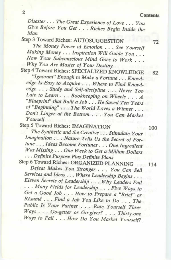 Contents - What Do You Want Most? - Tributes From Great American Leaders - Publisher's Preface - Author's Preface - Introduction - Desire - Faith - Auto-Suggestion - Specialized Knowledge - Imagination - Organized Planning - Decision - Persistence - Power of The Master Mind - The Mystery of Sex Transmutation - Subconscious Mind - Brain - Sixth Sense - How To Outwit The Six Ghosts of Fear