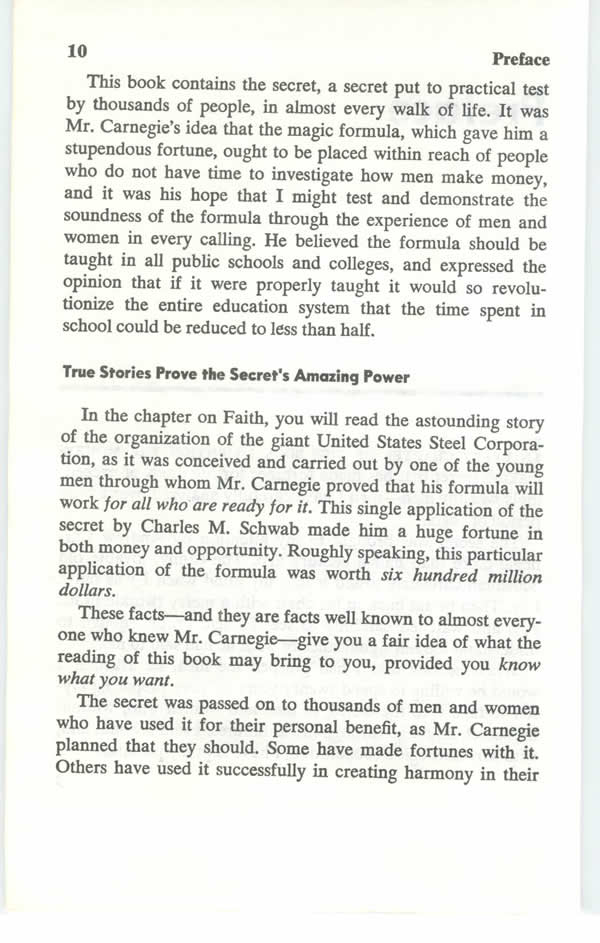 The secret to which I refer has been mentioned no fewer than a hundred times, throughout this book. It has not been directly named, for it seems to work more successfully when it is merely uncovered and left in sight, where THOSE WHO ARE READY, and SEARCHING FOR IT, may pick it up. That is why Mr. Carnegie tossed it to me so quietly, without giving me its specific name.