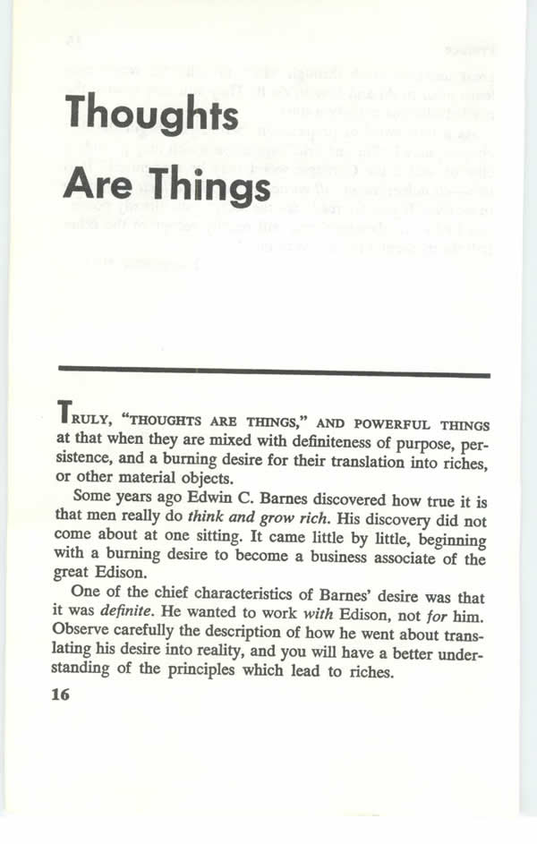 A little more than thirty years ago, Edwin C. Barnes discovered how true it is that men really do THINK AND GROW RICH. His discovery did not come about at one sitting. It came little by little, beginning with a BURNING DESIRE to become a business associate of the great Edison.