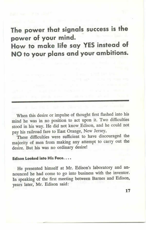 When this DESIRE, or impulse of thought, first flashed into his mind he was in no position to act upon it. Two difficulties stood in his way. He did not know Mr. Edison, and he did not have enough money to pay his railroad fare to Orange, New Jersey.