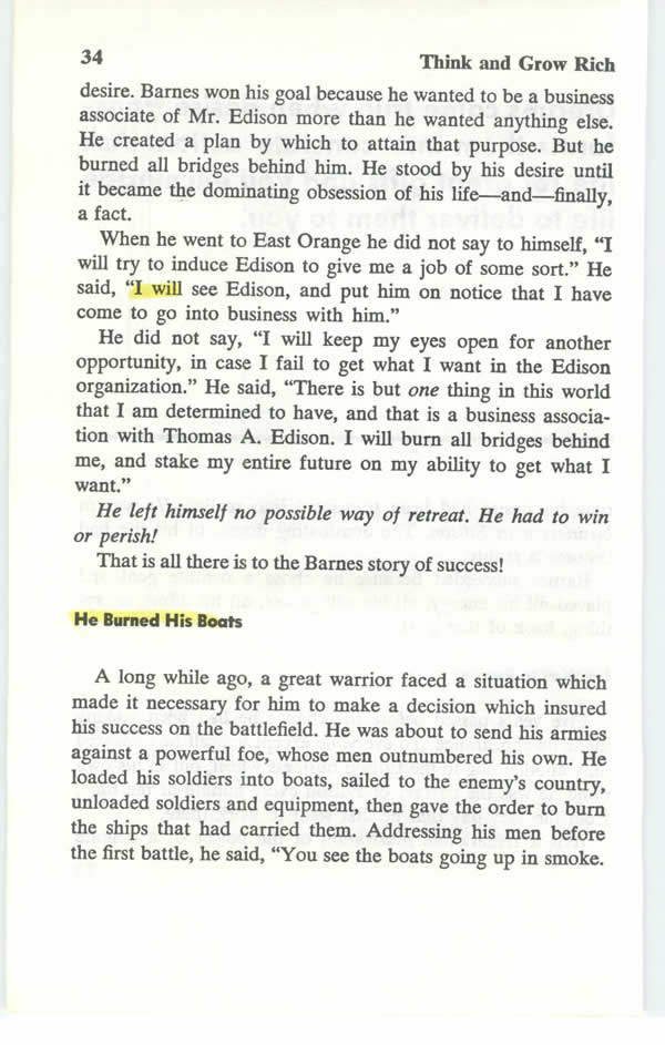That is all there is to the Barnes story of success! A long while ago, a great warrior faced a situation which made it necessary for him to make a decision which insured his success on the battlefield. He was about to send his armies against a powerful foe, whose men outnumbered his own. He loaded his soldiers into boats, sailed to the enemy's country, unloaded soldiers and equipment, then gave the order to burn the ships that had carried them. Addressing his men before the first battle, he said, "You see the boats going up in smoke. That means that we cannot leave these shores alive unless we win! We now have no choice-we win --- or we perish! They won.