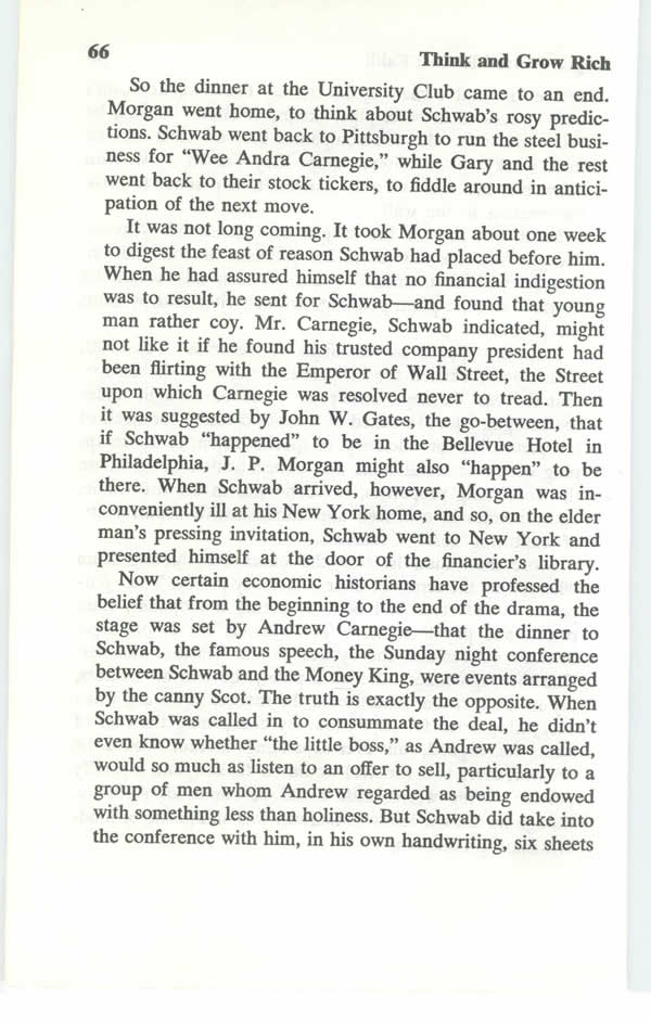 That giant organization was created in the mind of one man. The plan by which the organization was provided with the steel mills that gave it financial stability was created in the mind of the same man. His FAITH, his DESIRE, his IMAGINATION, his PERSISTENCE were the real ingredients that went into United States Steel. The steel mills and mechanical equipment acquired by the corporation, AFTER IT HAD BEEN BROUGHT INTO LEGAL EXISTENCE, were incidental, but careful analysis will disclose the fact that the appraised value of the properties acquired by the corporation increased in value by an estimated SIX HUNDRED MILLION DOLLARS, by the mere transaction which consolidated them under one management.
