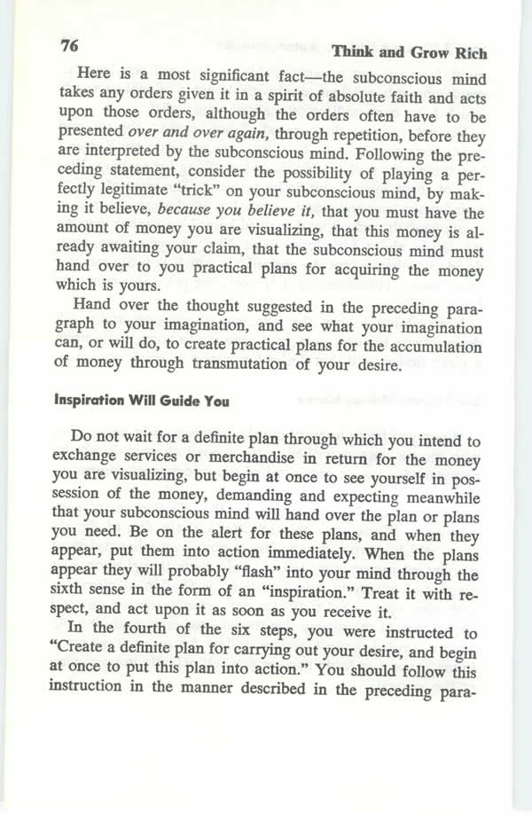 Contents - What Do You Want Most? - Tributes From Great American Leaders - Publisher's Preface - Author's Preface - Introduction - Desire - Faith - Auto-Suggestion - Specialized Knowledge - Imagination - Organized Planning - Decision - Persistence - Power of The Master Mind - The Mystery of Sex Transmutation - Subconscious Mind - Brain - Sixth Sense - How To Outwit The Six Ghosts of Fear