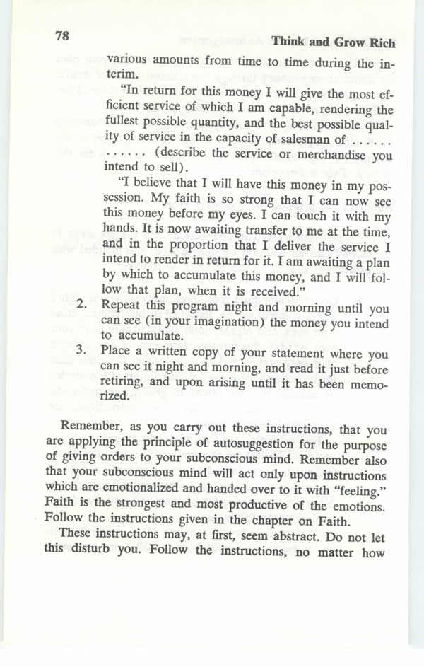 Contents - What Do You Want Most? - Tributes From Great American Leaders - Publisher's Preface - Author's Preface - Introduction - Desire - Faith - Auto-Suggestion - Specialized Knowledge - Imagination - Organized Planning - Decision - Persistence - Power of The Master Mind - The Mystery of Sex Transmutation - Subconscious Mind - Brain - Sixth Sense - How To Outwit The Six Ghosts of Fear
