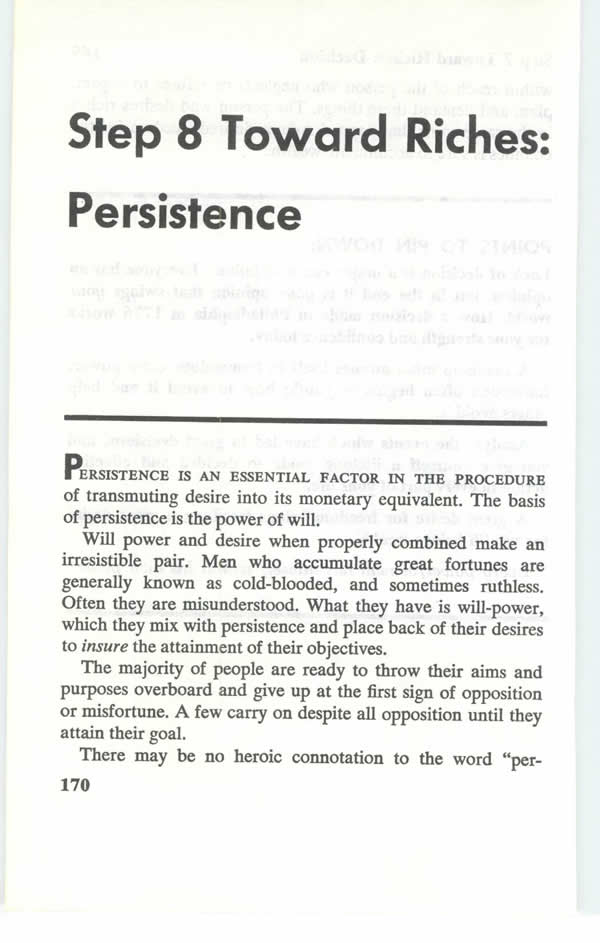 Contents - What Do You Want Most? - Tributes From Great American Leaders - Publisher's Preface - Author's Preface - Introduction - Desire - Faith - Auto-Suggestion - Specialized Knowledge - Imagination - Organized Planning - Decision - Persistence - Power of The Master Mind - The Mystery of Sex Transmutation - Subconscious Mind - Brain - Sixth Sense - How To Outwit The Six Ghosts of Fear