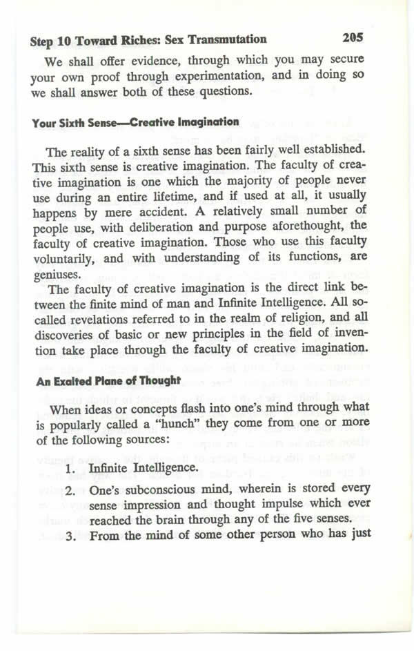 The result of sex transmutation, is the increase of the rate of vibration of thoughts to such a pitch that the Creative Imagination becomes highly receptive to ideas, which it picks up from the ether. On the other hand, when the brain is vibrating at a rapid rate, it not only attracts thoughts and ideas released by other brains through the medium of the ether, but it gives to one's own thoughts that "feeling" which is essential before those thoughts will be picked up and acted upon by one's subconscious mind. Thus, you will see that the broadcasting principle is the factor through which you mix feeling, or emotion with your thoughts and pass them on to your subconscious mind.