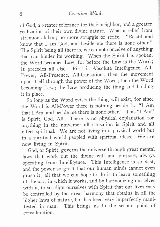 of God, a greater tolerance for their neighbor, and a greater realization of their own divine nature. What a relief from strenuous labor; no more struggle or strife. "Be still and know that I am God, and beside me there is none other." The Spirit being all there is, we cannot conceive of anything that can hinder its working. When the Spirit has spoken, the Word becomes Law, for before the Law is the Word; It precedes all else. First is Absolute Intelligence, All-Power, All-Presence, All-Causation; then the movement upon itself through the power of the Word; then the Word becoming Law; the Law producing the thing and holding it in place.