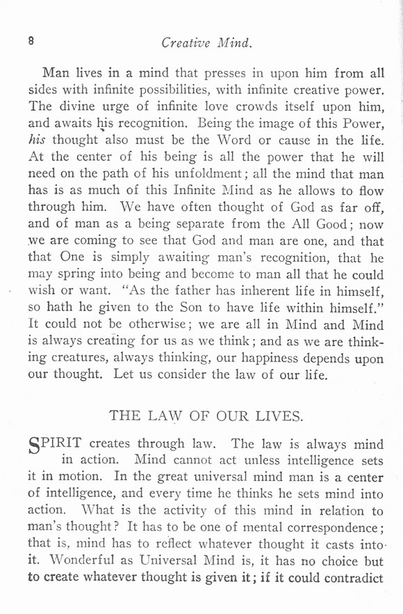 Man lives in a mind that presses in upon him from all sides with infinite possibilities, with infinite creative power. The divine urge of infinite love crowds itself upon him, and awaits his recognition. Being the image of this Power, his thought also must be the Word or cause in the life. At the center of his being is all the power that he will need on the path of his unfoldment; all the mind that man has is as much of this Infinite Mind as he allows to flow through him. We have often thought of God as far off, and of man as a being separate from the All Good; now we are coming to see that God and man are one, and that that One is simply awaiting man's recognition, that he may spring into being and become to man all that he could wish or want. "As the father has inherent life in himself, so hath he given to the Son to have life within himself." It could not be otherwise; we are all in Mind and Mind is always creating for us as we think; and as we are thinking creatures, always thinking, our happiness depends upon our thought. Let us consider the law of our life.