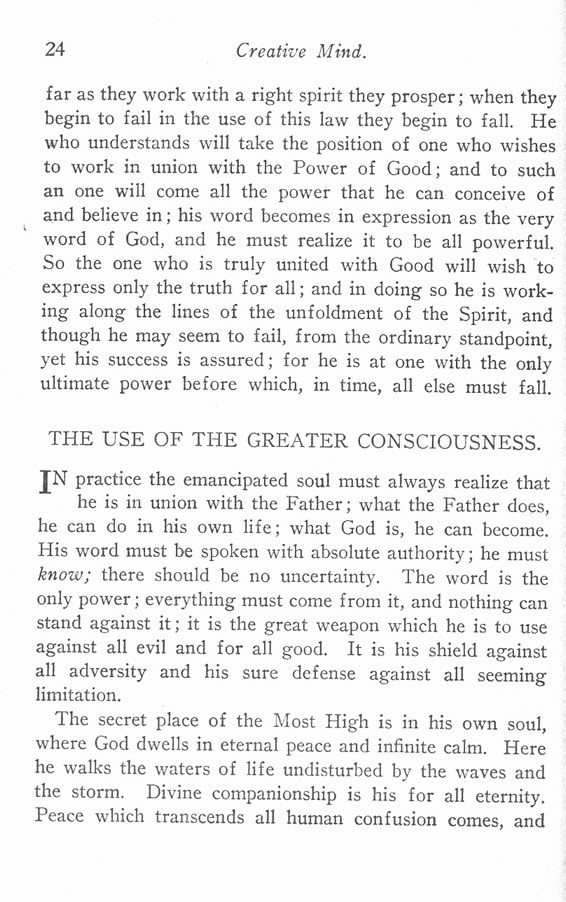 far as they work with a right spirit they prosper; when they begin to fail in the use of this law they begin to fall. He who understands will take the position of one who wishes to work in union with the Power of Good; and to such an one will come all the power that he can conceive of and believe in; his word becomes in expression as the very word of God, and he must realize it to be all powerful. So the one who is truly united with Good will wish to express only the truth for all; and in doing so he is working along the lines of the unfoldment of the Spirit, and though he may seem to fail, from the ordinary standpoint, yet his success is assured; for he is at one with the only ultimate power before which, in time, all else must fall.