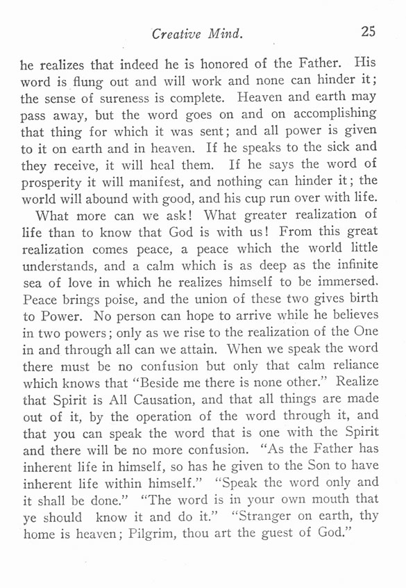 What more can we ask! What greater realization of life than to know that God is with us! From this great realization comes peace, a peace which the world little understands, and a calm which is as deep as the infinite sea of love in which he realizes himself to be immersed. Peace brings poise, and the union of these two gives birth to Power. No person can hope to arrive while he believes in two powers; only as we rise to the realization of the One in and through all can we attain. When we speak the word there must be no confusion but only that calm reliance which knows that "Beside me there is none other." Realize that Spirit is All Causation, and that all things are made out of it, by the operation of the word through it, and that you can speak the word that is one with the Spirit and there will be no more confusion. "As the Father has inherent life in himself, so has he given to the Son to have inherent life within himself." "Speak the word only and it shall be done." "The word is in your own mouth that ye should know it and do it." "Stranger on earth, thy home is heaven; Pilgrim, thou art the guest of God."