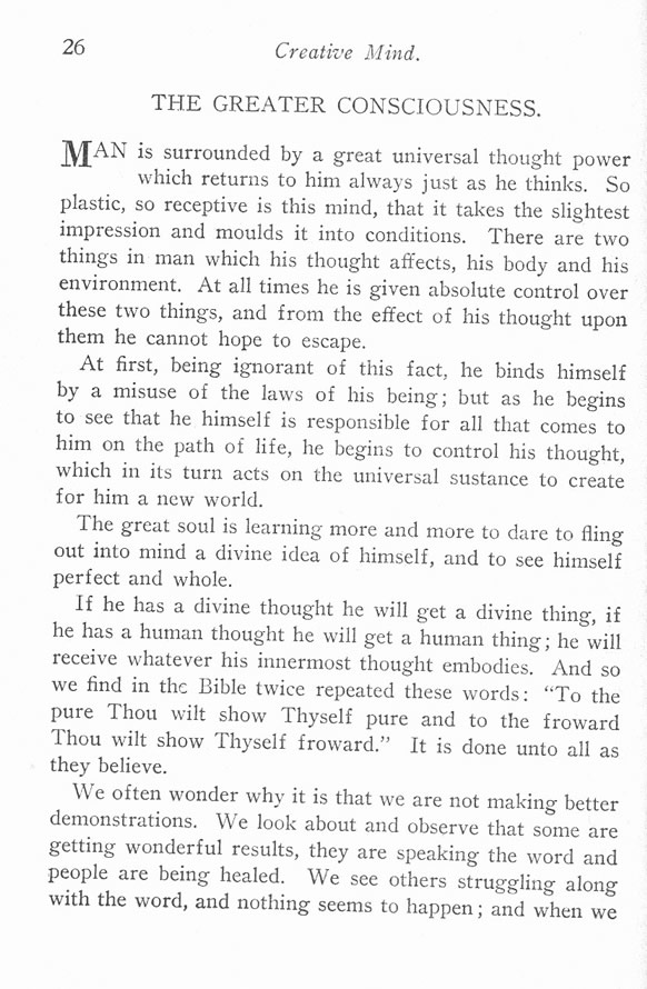 MAN is surrounded by a great universal thought power which returns to him always just as he thinks. So plastic, so receptive is this mind, that it takes the slightest impression and moulds it into conditions. There are two things in man which his thought affects, his body and his environment. At all times he is given absolute control over these two things, and from the effect of his thought upon them he cannot hope to escape.