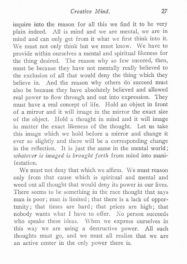 inquire into the reason for all this we find it to be very plain indeed. All is mind and we are mental, we are in mind and can only get from it what we first think into it. We must not only think but we must know. We have to provide within ourselves a mental and spiritual likeness for the thing desired. The reason why so few succeed, then, must be because they have not mentally really believed to the exclusion of all that would deny the thing which they believe in. And the reason why others do succeed must also be because they have absolutely believed and allowed real power to flow through and out into expression. They must have a real concept of life. Hold an object in front of a mirror and it will image in tile mirror the exact size of the object. Hold a thought in mind and it will image in matter the exact likeness of the thought. Let us take this image which we hold before a mirror and change it ever so slightly and there will be a corresponding change in the reflection. It is just the same in the mental world; whatever is imaged is brought forth from mind into manifestation.