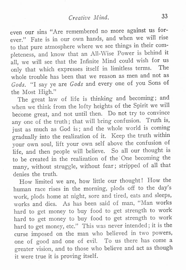 How limited we are, how little our thought! How the human race rises in the morning, plods off to the day's work, plods home at night, sore and tired, eats and sleeps, works and dies. As has been said of man, "Man works hard to get money to buy food to get strength to work hard to get money to buy food to get strength to work hard to get money, etc." This was never intended; it is the curse imposed on the man who believed in two powers, one of good and one of evil. To us there has come a greater vision, and to those who believe and act as though it were true it is proving itself.