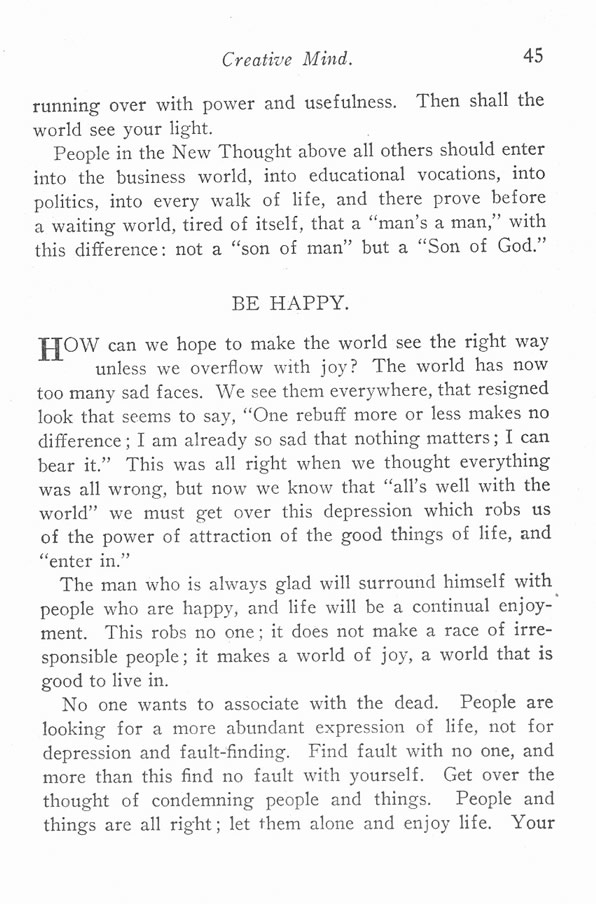 People in the New Thought above all others should enter into the business world, into educational vocations, into politics, into every walk of life, and there prove before a waiting world, tired of itself, that a "man's a man," with this difference: not a "son of man" but a "Son of God."