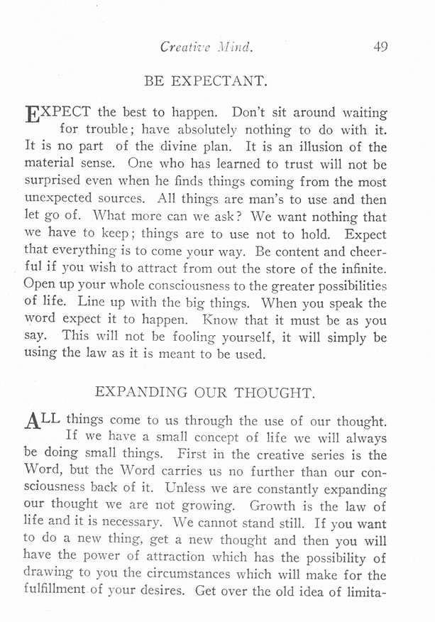 EXPECT the best to happen. Don't sit around waiting for trouble; have absolutely nothing to do with it. It is no part of the divine plan. It is an illusion of the material sense. One who has learned to trust will not be surprised even when he finds things coming from the most unexpected sources. All things are man's to use and then let go of. What more can we ask? We want nothing that we have to keep; things are to use not to hold. Expect that everything is to come your way. Be content and cheerful if you wish to attract from out the store of the infinite. Open up your whole consciousness to the greater possibilities of life. Line up with the big things. When you speak the word expect it to happen. Know that it must be as you say. This will not be fooling yourself, it will simply be using the law as it is meant to be used.