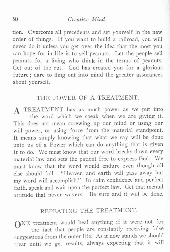 A TREATMENT has as much power as we put into the word which we speak when we are giving it. This does not mean screwing up our mind or using our will power, or using force from the material standpoint. It means simply knowing that what we say will be done unto us of a Power which can do anything that is given It to do. We must know that our word breaks down every material law and sets the patient free to express God. We must know that the word would endure even though all else should fail. "Heaven and earth will pass away but my word will accomplish." In calm confidence and perfect faith, speak and wait upon the perfect law, Get that mental attitude that never wavers. Be sure and it will be done.
