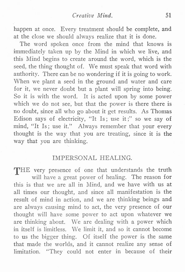 The word spoken once from the mind that knows is immediately taken up by the Mind in which we live, and this Mind begins to create around the word, which is the seed, the thing thought of. We must speak that word with authority. There can be no wondering if it is going to work. When we plant a seed in the ground and water and care for it, we never doubt but a plant will spring into being. So it is with the word. It is acted upon by some power which we do not see, but that the power is there there is no doubt, since all who go about it get results. As Thomas Edison says of electricity, "It Is; use it ;" so we say of mind, "It Is; use it." Always remember that your every thought is the way that you are treating, since it is the way that you are thinking.