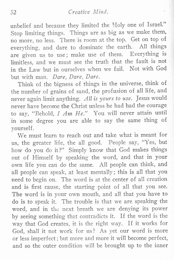 We must learn to reach out and take what is meant for us, the greater life, the all good. People say, "Yes, but how do you do it ?" Simply know that God makes things out of Himself by speaking the word, and that in your own life you can do the same. All people can think, and all people can speak, at least mentally; this is all that you need to begin on. The word is at the center of all creation and is first cause, the starting point of all that you see. The word is in your own mouth, and all that you have to do is to speak it. The trouble is that we are speaking the word, and in the next breath we are denying its power by seeing something that contradicts it. If the word is the way that God creates, it is the right way. If it works for God, shall it not work for us? As yet our word is more or less imperfect; but more and more it will become perfect, and so the outer condition will be brought up to the inner