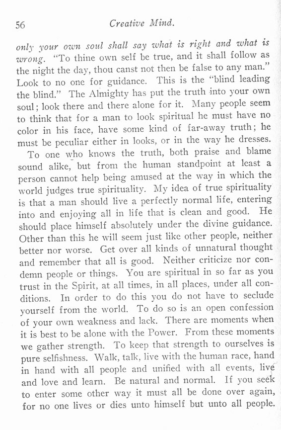 only your own soul shall say what is right and what is wrong. "To thine own self be true, and it shall follow as the night the day, thou canst not then be false to any man." Look to no one for guidance. This is the "blind leading the blind." The Almighty has put the truth into your own soul; look there and there alone for it. Many people seem to think that for a man to look spiritual he must have no color in his face, have some kind of far-away truth; he must be peculiar either in looks, or in the way he dresses.
