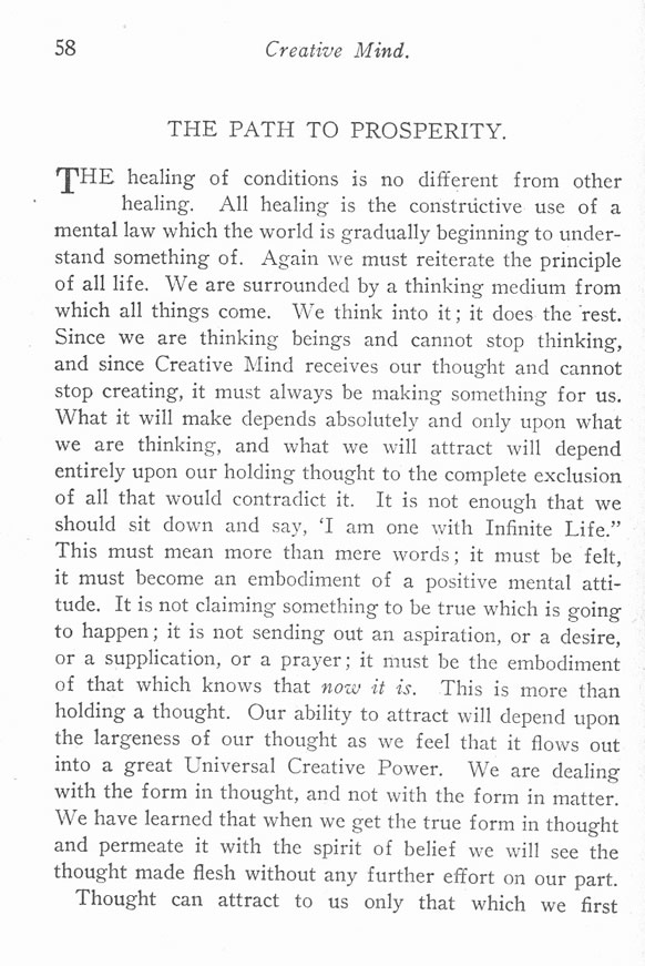 THE healing of conditions is no different from other healing. All healing is the constructive use of a mental law which the world is gradually beginning to understand something of. Again we must reiterate the principle of all life. We are surrounded by a thinking medium from which all things come. We think into it; it does the rest. Since we are thinking beings and cannot stop thinking, and since Creative Mind receives our thought and cannot stop creating, it must always be making something for us. What it will make depends absolutely and only upon what we are thinking, and what we will attract will depend entirely upon our holding thought to the complete exclusion of all that would contradict it. It is not enough that we should sit down and say, "I am one with Infinite Life." This must mean more than mere words; it must be felt, it must become an embodiment of a positive mental attitude. It is not claiming something to be true which is going to happen; it is not sending out an aspiration, or a desire, or a supplication, or a prayer; it must be the embodiment of that which knows that now it is. This is more than holding a thought. Our ability to attract will depend upon the largeness of our thought as we feel that it flows out into a great Universal Creative Power. We are dealing with the form in thought, and not with the form in matter. We have learned that when we get the true form in thought and permeate it with the spirit of belief we will see the thought made flesh without any further effort on our part.