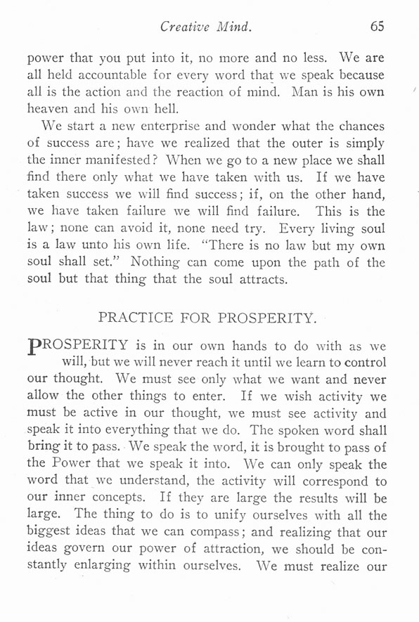PROSPERITY is in our own hands to do with as we will, but we will never reach it until we learn to control our thought. We must see only what we want and never allow the other things to enter. If we wish activity we must be active in our thought, we must see activity and speak it into everything that we do. The spoken word shall bring it to pass. We speak the word, it is brought to pass of the Power that we speak it into. We can only speak the word that we understand, the activity will correspond to our inner concepts. If they are large the results will be large. The thing to do is to unify ourselves with all the biggest ideas that we can compass; and realizing that our ideas govern our power of attraction, we should be constantly enlarging within ourselves. We must realize our