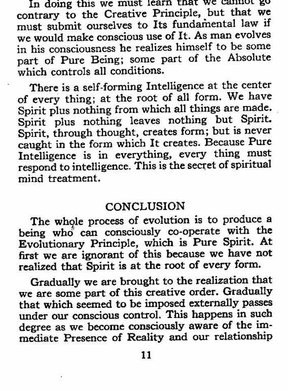 Contents - The Universe is a Spiritual System - The higher ... must always govern the lower - Everything ... rises out of One fundamental Unity - conscious mind ... subjective reaction - creative Subjectivity ... all-permeating Creative Medium - We must learn to trust in the law of growth - The Universal Spirit - No matter how high we go in the spiritual realm - Relative First Cause - Nothing is more important - The will is a directive power - The basis of all mental healing