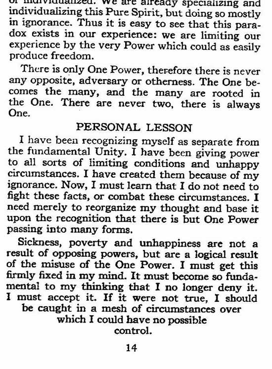 I have been recognizing myself as separate from the fundamental Unity. I have been giving power to all sorts of limiting conditions and unhappy circumstances. I have created them because of my ignorance. Now, I must learn that I do not need to fight these facts, or combat these circumstances. I need merely to reorganize my thought and base it upon the recognition that there is but One Power passing into many forms.