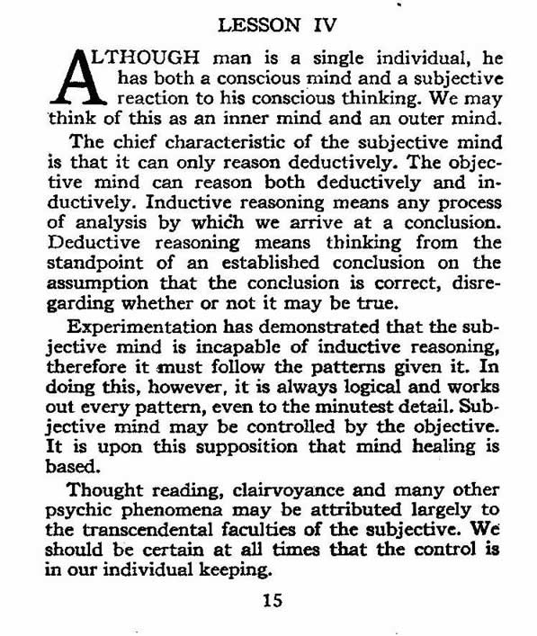 Experimentation has demonstrated that the subjective mind is incapable of inductive reasoning; therefore it must follow the patterns given it. In doing this, however, it is always logical and works out every pattern, even to the minutest detail. Subjective mind may be controlled by the objective. It is upon this supposition that mind healing is based.