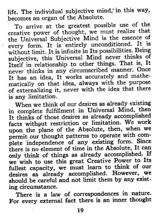 When we think of our desires as already existing in complete fulfillment in Universal Mind, then It thinks of those desires as already accomplished facts without restriction or limitation. We work upon the plane of the Absolute, then, when we permit our thought patterns to operate with complete independence of any existing form. Since there is no element of time in the Absolute, It can only think of things as already accomplished. If we wish to use this great Creative Power to Its fullest capacity, we must learn to think of our desires as already accomplished. However, we should be careful and not limit them by any existing circumstance. There is a law of correspondences in nature. For every external fact there is an inner thought
