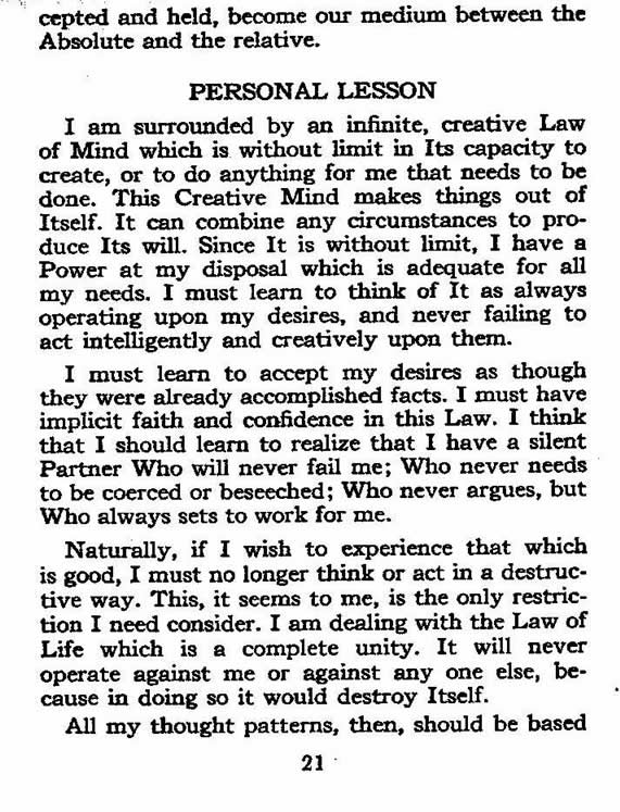 I am surrounded by an infinite, creative Law of Mind which is without limit in Its capacity to create or to do anything for me that needs to be done. This Creative Mind makes things out of Itself. It can combine any circumstances to produce Its will. Since It is without limit, I have a Power at my disposal which is adequate for all my needs. I must learn to think of It as always operating upon my desires and never failing to act intelligently and creatively upon them.