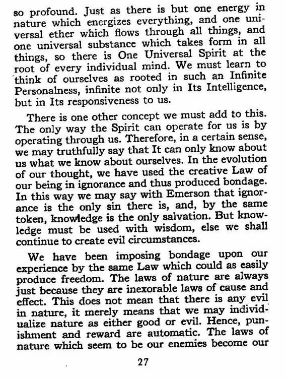 There is one other concept we must add to this. The only way the Spirit can operate for us is by operating through us. Therefore, in a certain sense, we may truthfully say that It can only know about us what we know about ourselves. In the evolution of our thought, we have used the creative Law of our being in ignorance and thus produced bondage. In this way we may say with Emerson that ignorance is the only sin there is, and, by the same token, knowledge is the only salvation. But knowledge must be used with wisdom; else we shall continue to create evil circumstances.