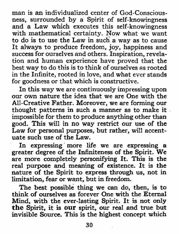 In this way we are continuously impressing upon our own nature the idea that we are One with the All-Creative Father. Moreover, we are forming our thought patterns in such a manner as to make it impossible for them to produce anything other than good. This will in no way restrict our use of the Law for personal purposes, but rather, will accentuate such use of the Law.
