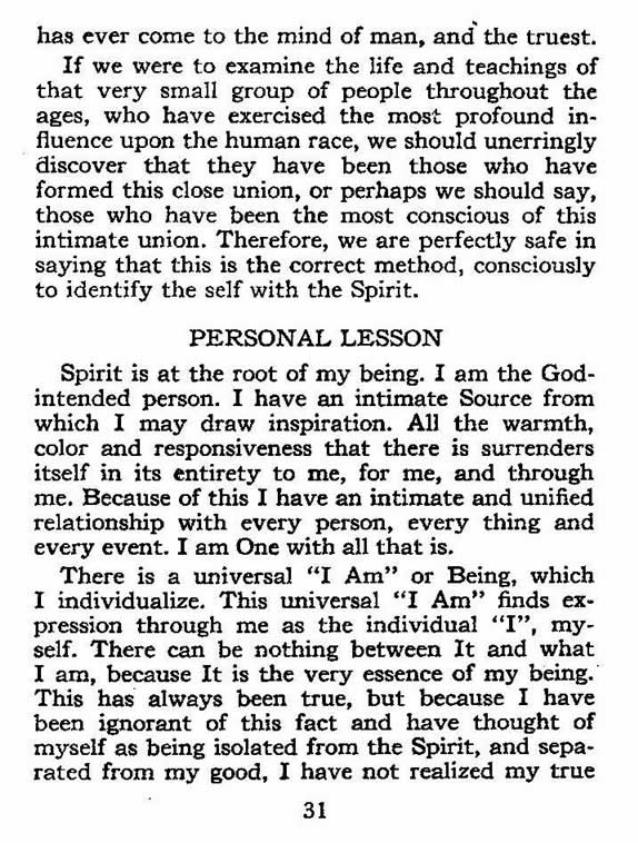There is a universal "I Am" or Being, which I individualize. This universal "I Am" finds expression through me as the individual "I", myself. There can be nothing between It and what I am; Because It is the very essence of my being. This has always been true, but because I have been ignorant of this fact and have thought of myself as being isolated from the Spirit, and separated from my good, I have not realized my true