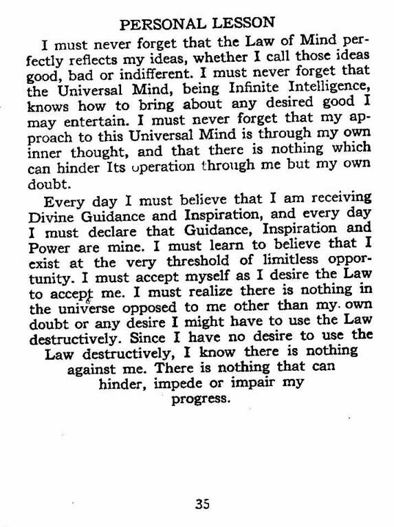 I must never forget that the Law of Mind perfectly reflects my ideas, whether I call those ideas good, bad or indifferent. I must never forget that the Universal Mind, being Infinite Intelligence, knows how to bring about any desired good I may entertain. I must never forget that my approach to this Universal Mind is through my own inner thought, and that there is nothing which can hinder Its operation through me but my own doubt.