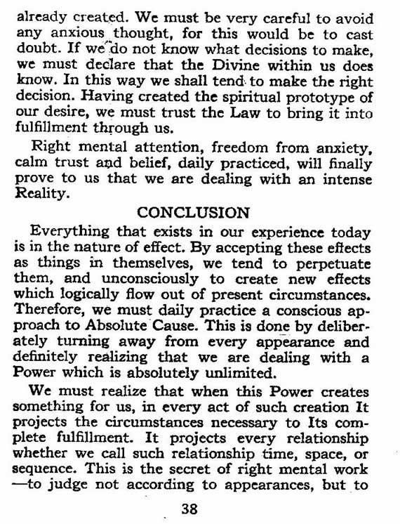 already created. We must be very careful to avoid any anxious thought, for this would be to cast doubt. If we do not know what decisions to make, we must declare that the Divine within us does know. In this way we shall tend to make the right decision. Having created the spiritual prototype of our desire, we must trust the Law to bring it into fulfillment through us. Right mental attention, freedom from anxiety, calm trust and belief, daily practiced, will finally prove to us that we are dealing with an intense Reality.