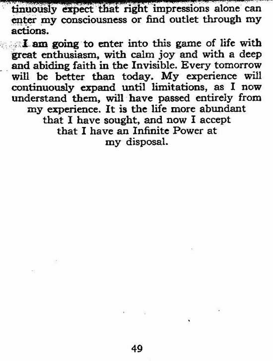 I am going to enter into this game of life with great enthusiasm, with calm joy and with a deep and abiding faith in the Invisible. Every tomorrow will be better than today. My experience will continuously expand until limitations, as I now understand them; will have passed entirely from my experience. It is the life more abundant that I have sought, and now I accept that I have an Infinite Power at my disposal.