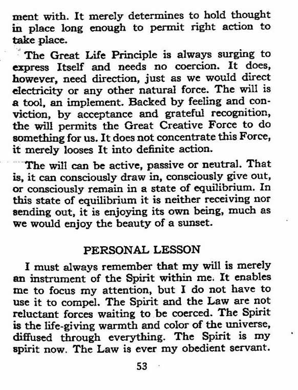 The Great Life Principle is always surging to express Itself and needs no coercion. It does, however need direction, just as we would direct electricity or any other natural force. The will is a tool an implement. Backed by feeling and conviction by acceptance and grateful recognition, the will permits the Great Creative Force to do something for us. It does not concentrate this Force; it merely looses It into definite action.