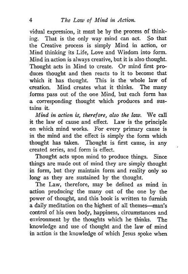 The Law, therefore, may be defined as mind in action producing the many put of the one by the power of thought, and this book is written to furnish a daily meditation on the highest of all themes — man's control of his own body, happiness, circumstances and environment by the thoughts which he thinks. The knowledge and use of thought and the law of mind in action is the knowledge of which Jesus spoke when