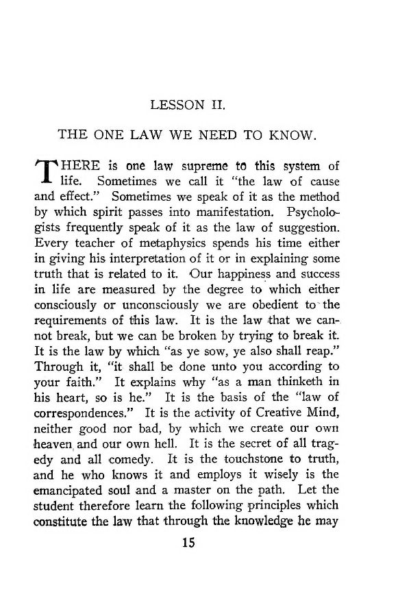 THERE is one law supreme to this system of life. Sometimes we call it "the law of cause and effect." Sometimes we speak of it as the method by which spirit passes into manifestation. Psychologists frequently speak of it as the law of suggestion. Every teacher of metaphysics spends his time either in giving his interpretation of it or in explaining some truth that is related to it. Our happiness and success in life are measured by the degree to which either consciously or unconsciously we are obedient to the requirements of this law. It is the law that we cannot break, but we can be broken by trying to break it. It is the law by which "as ye sow, ye also shall reap." Through it, "it shall be done unto you according to your faith." It explains why "as a man thinketh in his heart, so is he." It is the basis of the "law of correspondences." It is the activity of Creative Mind, neither good nor bad, by which we create our own heaven, and our own hell. It is the secret of all tragedy and all comedy. It is the touchstone to truth, and he who knows it and employs it wisely is the emancipated soul and a master on the path. Let the student therefore learn the following principles which constitute the law that through the knowledge he may