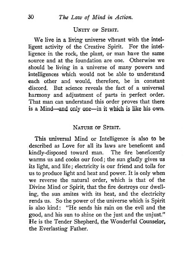 This universal Mind or Intelligence is also to be described as Love for all its laws are beneficent and kindly-disposed toward man. The fire beneficently warms us and cooks our food; the sun gladly gives us its light, and life; electricity is our friend and toils for us to produce light and heat and power. It is only when we reverse the natural order, which is that of the Divine Mind or Spirit, that the fire destroys our dwelling, the sun smites with its heat, and the electricity rends us. So the power of the universe which is Spirit is also kind: "He sends his rain on the evil and the good, and his sun to shine on the just and the unjust." He is the Tender Shepherd, the Wonderful Counselor, the Everlasting Father.
