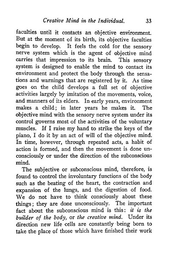 The subjective or subconscious mind, therefore, is found to control the involuntary functions of the body such as the beating of the heart, the contraction and expansion of the lungs, and the digestion of food. We do not have to think consciously about these things; they are done unconsciously. The important fact about the subconscious mind is this: it is the builder of the body, or the creative mind. Under its direction new life cells are constantly being born to take the place of those which have finished their work