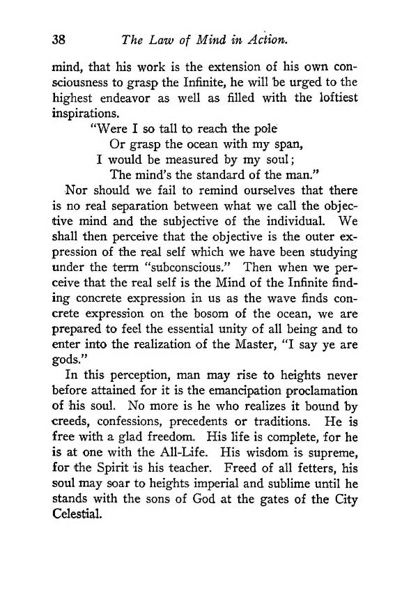 Nor should we fail to remind ourselves that there is no real separation between what we call the objective mind and the subjective of the individual. We shall then perceive that the objective is the outer expression of the real self which we have been studying under the term "subconscious." Then when we perceive that the real self is the Mind of the Infinite finding concrete expression in us as the wave finds concrete expression on the bosom of the ocean, we are prepared to feel the essential unity of all being and to enter into the realization of the Master, "I say ye are gods."