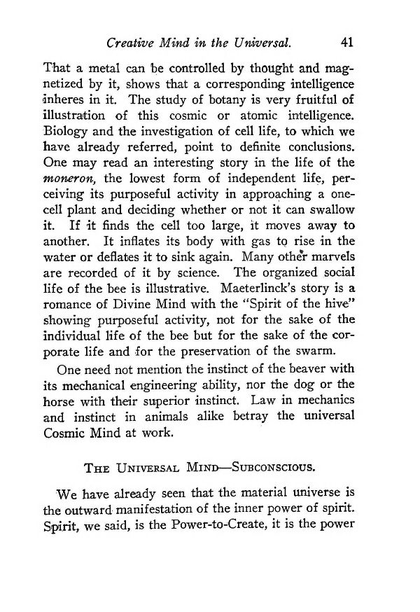 That a metal can be controlled by thought and magnetized by it, shows that a corresponding intelligence inheres in it. The study of botany is very fruitful of illustration of this cosmic or atomic intelligence. Biology and the investigation of cell life, to which we have already referred, point to definite conclusions. One may read an interesting story in the life of the moneron, the lowest form of independent life, perceiving its purposeful activity in approaching a one-cell plant and deciding whether or not it can swallow it. If it finds the cell too large, it moves away to another. It inflates its body with gas to rise in the water or deflates it to sink again. Many other marvels are recorded of it by science. The organized social life of the bee is illustrative. Maeterlinck's story is a romance of Divine Mind with the "Spirit of the hive" showing purposeful activity, not for the sake of the individual life of the bee but for the sake of the corporate life and for the preservation of the swarm.